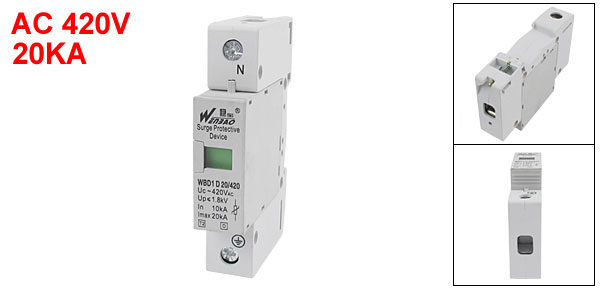 Product Name Surge Protective Device Model WBD1D Pole 1P Max. Continuous Operating Voltage(Uc) AC 420V Maximum Dishcharge Current(Imax) 20KA Nominal Dishcharging Current (In) 10KA Portection Level <=1.8KV Mount Type Standard 35mm DIN Rail Dimension 90 x 60 x 18mm/ 3.5" x 2.4" x 0.7" (L*W*H)