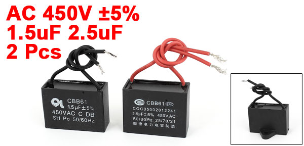 Product Name Motor Capacitor Model CBB61 External Material Plastic Dielectric Material Metalized Polypropylene Film Rated Capacitance 1.5uF 2.5uF Tolerance ±5% Rated Frequency 50/60Hz Rated Voltage AC 450V Body Size 37 x 30 x 28mm/ 1.45" x 1.2" x 1.1"(L*W*T) Fixing Hole Diameter 4mm/0.16" Cable Length 8cm/ 3.1" Net Weight 41g Package Content 2 x Motor Capacitor - Reviews
