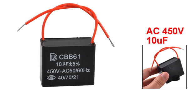 Product Name Motor Capacitor Housing Material Plastic Dielectric Material Metalized Polypropylene Model CBB61 Capacitance 10uF Tolerance +/-5% Rated Voltage AC 450V Frequency 50/60Hz Temperature Range 40/70/21 Body Size 4.8 x 3.8 x 2.6cm / 1.89" x 1.5" x 1.0" (L * W * T) Hole Diameter 0.4cm / 0.157" Wire Length(Approx.) 10cm / 3.9" Color Black, Red Weight 51g Package Content 1 x Motor Capacitor - Reviews