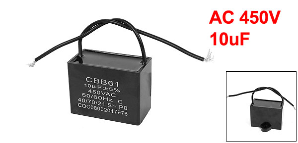 Terminal 2Pin Rated Capacitance 10uF Tolerance ± 5% Rated Frequency 50/60Hz Rated Voltage 450V AC Body Size 4.5 x 3.5 x 2.5cm / 1.8" x 1.4" x 1" (L*W*H) Main Color Black Weight 52g Package Content 1 x Motor Run Capacitor  - Reviews