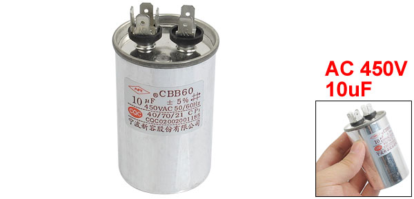 Product Name Capacitor Model CBB60 Dielectric Material Metallized Polypropylene Capacitor Rated Capacitance 10uF Tolerance +/-5% Rated Frequency 50/60Hz Operating Temperature 40/70/21 Rated Voltage 450V AC Size 7.1 x 4.5cm/ 2.8" x 1.8"(H*D) Main Color Silver Tone Weight 109g Package Content 1 x Capacitor - Reviews