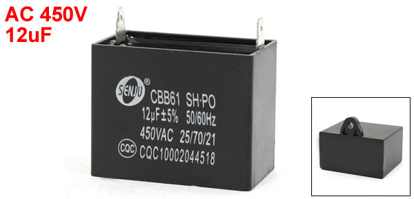 Product Name Motor Run Capacitor Material Polypropylene Film Rated Capacitance 12uF Tolerance ±5% Model CBB61 Rated Frequency 50/60 Hz Rated Voltage 450V AC Overall Size 49x 38 x 27mm/ 1.9" x 1.5" x 1.06"(L*W*T) Mount Hole Dia 4mm/ 0.16" Pin Size 10 x 4mm/ 0.4" x 0.16"(L*W) Pin Spacing 42mm/ 1.65" Main Color Black Weight 58g Package Content 1 x Motor Run Capacitor - Reviews