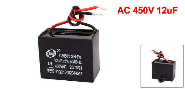 Product Name Motor Capacitor Model CBB61 Color Black External Material Plastic Dielectric Material Metalized Polypropylene Film Rated Capacitance 12uF Tolerance +/-5% Rated Frequency 50/60Hz Rated Voltage AC 450V Ambient Temperature 25/70/21 Body Size 40 x 50 x 28mm/ 1.6" x 2" x 1.1"(L*W*T) Fixing Hole Diameter 4mm/0.15" Cable Length 10cm/ 3.9" Net Weight 61g Package Content 1 x Motor Capacitor - Reviews