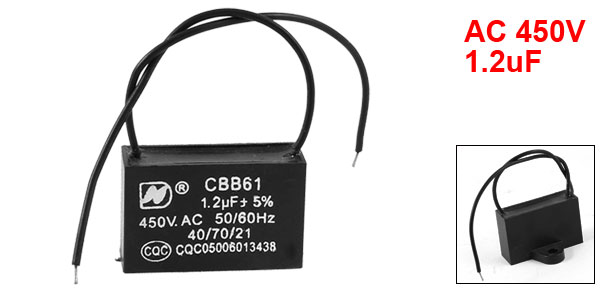 Terminal Wire Ambient Temperature 40/70/21 Rated Capacitance 1.2uF Tolerance ± 5% Rated Frequency 50/60Hz Rated Voltage 450V AC Size 3.7 x 2.3 x 1.2cm/1.45" x 0.9" x 0.47"(L*W*T) Wire Length 10cm/ 3.9" Install Bore Diameter 0.5cm/ 0.2" Main Color Black Weight 15g Package Content 1 x Motor Run Capacitor - Reviews