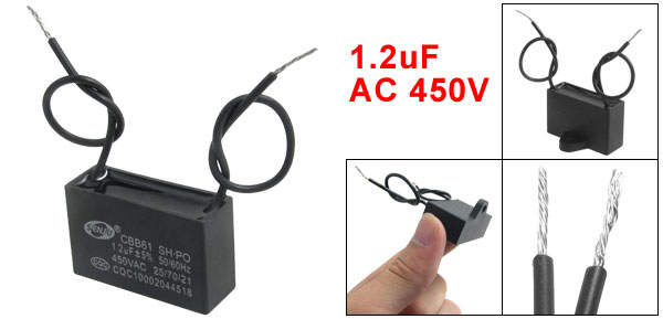 Terminal Wire Ambient Temperature 25/70/21 Rated Capacitance 1.2uF Tolerance 5% Rated Frequency 50/60Hz Rated Voltage 450V AC Size 3.5 x 2.2 x 1.2cm/1.37" x 0.86" x 0.47"(L*W*T) Wire Length 10cm/ 3.9" Install Bore Diameter 0.5cm/ 0.2" Main Color Black Weight 14g Package Content 1 x Motor Run Capacitor - Reviews