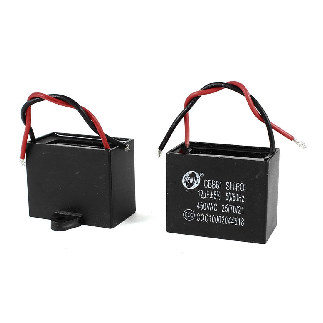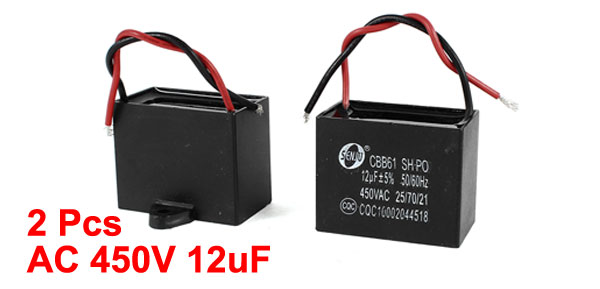 Product Name Motor Run Capacitor Model CBB61 Material Polypropylene Film Rated Capacitance 12uF Tolerance 5% Rated Frequency 50/60 Hz Rated Voltage 450V AC Overall Size 49 x 39 x 40mm/ 1.9" x 1.5" x 1.6"(L*W*T) Mount Hole Dia 4.8mm/ 0.19" Wire Length 9cm/ 3.5" Main Color Black,Red Net Weight 127g Package Content 2 x Motor Run Capacitor - Reviews