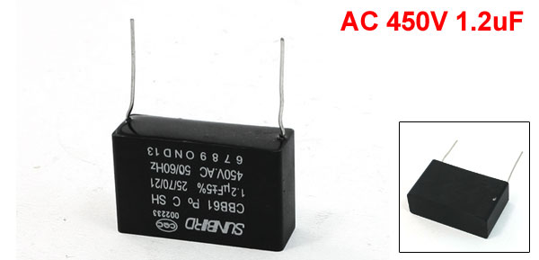 Product Name Capacitor Model CBB61 Type Polypropylene Film Capacitor Material(External) Plastic Rated Capacitance 1.2uF Tolerance +/-5% Rated Frequency 50/60Hz Rated Voltage 450V.AC Size 3.5 x 1 x 2.2cm/1.38" x 0.4" x 0.87"(L*W*T) Pin Length 1.7cm/0.67" Distance between Pins 3cm/0.18" Main Color Black Weight 13g Package Content 1 x Capacitor - Reviews