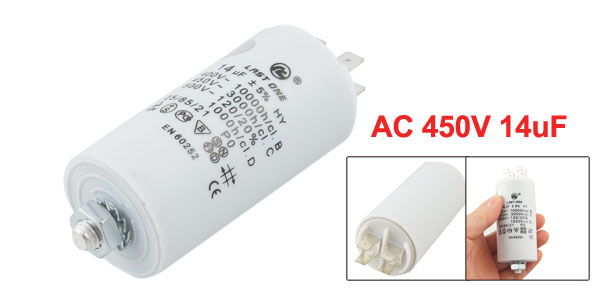 Product Name Motor Capacitor Dielectric Material Polypropylene Film Housing Material Plastic Capacitance 14uF Tolerance +/-5% Rated Voltage AC 450V Size 3.5 x 7cm/ 1.4" x 2.8" (Dia.*H) Thread Diameter 8mm/ 0.3" Color White Weight 85g Package Content 1 x Motor Capacitor - Reviews