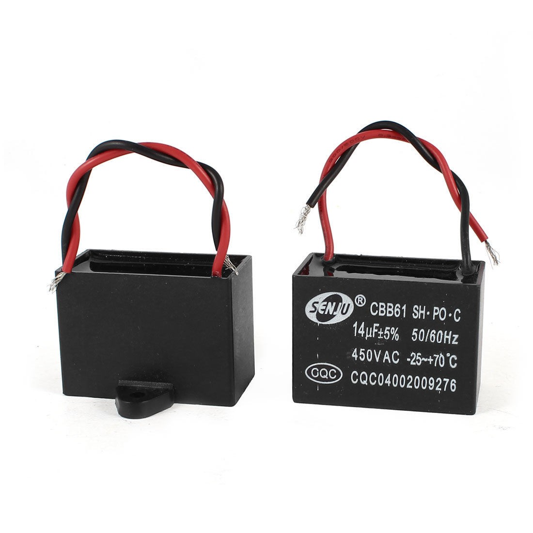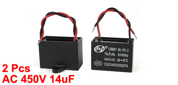 Product Name Motor Run Capacitor Model CBB61 Material Polypropylene Film Rated Capacitance 14uF Tolerance 5% Rated Frequency 50/60 Hz Rated Voltage 450V AC Overall Size 49 x 39 x 35mm/ 1.9" x 1.5" x 1.4"(L*W*T) Mount Hole Dia 4.5mm/ 0.18" Wire Length 9cm/ 3.5" Main Color Black,Red Net Weight 109g Package Content 2 x Motor Run Capacitor - Reviews