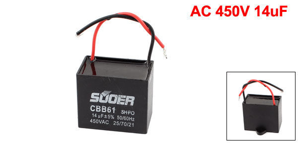 Product Name Motor Capacitor Model CBB61 Color Black External Material Plastic Dielectric Material Metallized Polypropylene Film Rated Capacitance 14uF Tolerance +/5% Rated Frequency 50/60Hz Rated Voltage AC 450V Body Size 50 x 30 x 45mm/ 2" x 1.2" x 1.8"(H*W*T) Fixing Hole Diameter 5mm/0.2" Cable Length 9cm/ 3.6" Net Weight 90g Package Content 1 x Motor Run Capacitor - Reviews