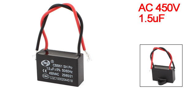 Product Name Motor Run Capacitor Model CBB61 Color Black External Material Plastic Dielectric Material Metalized Polypropylene Film Rated Capacitance 1.5uF Tolerance ±5% Rated Frequency 50/60Hz Rated Voltage AC 450V Body Size 38 x 24 x 25mm/ 1.5" x 0.9" x 1"(H*W*T) Fixing Hole Diameter 4.5mm/0.18" Cable Length 10cm/ 3.9" Net Weight 18g Package Content 1 x Motor Run Capacitor - Reviews