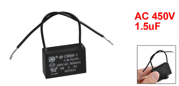 Product Name Motor Run Capacitor Model CBB6-1 Material Polypropylene, Plastic Rated Capacitance 1.5uF Tolerance +/-5% Rated Frequency 50/60 Hz Rated Voltage 450V AC Temperature Range 40/ 70/ 21 Body Size 3.7 x 2.5 x 1.3cm / 1.5" x 1.0" x 0.5" (L*W*T) Mount Hole Dia. 5mm / 0.2" Wire Length 9cm / 3.5" Main Color Black Weight 16g Package Content 1 x Motor Run Capacitor - Reviews