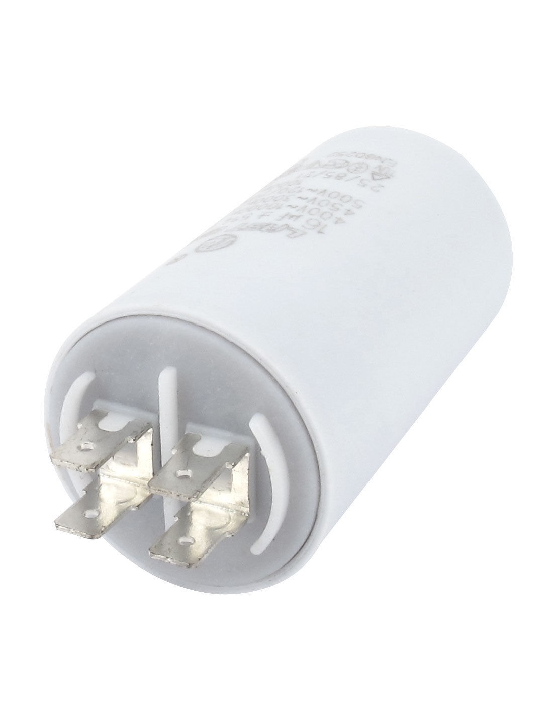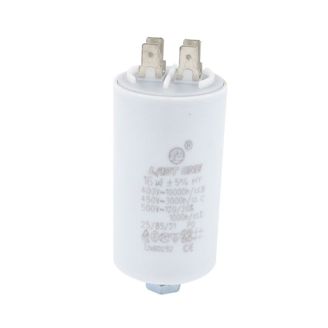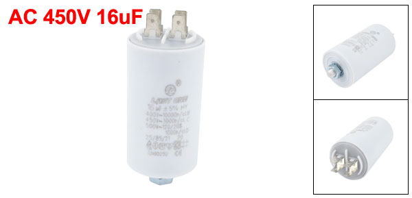 Product Name Motor Capacitor Housing Material Plastic Dielectric Material Polypropylene Film Capacitance 16uF Tolerance ±5% Rated Voltage AC 450V Frequency 50/60Hz Body Size 4 x 6.8cm/ 1.6" x 2.7"(D*H) Terminals 4 Thread Dia 7.7mm/ 0.3" Color White Weight 94g Package Content 1 x Motor Capacitor - Reviews