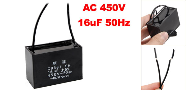 Product Name Capacitor Model CBB61 Material Polypropylene Film Rated Capacitance 16uF Tolerance ±5% Rated Frequency 50Hz Rated Voltage AC 450V Size 5.7 x 2.9 x 3.8cm/2.2" x 1.1" x 1.5"(L*W*T) Mounting Hole Diameter 0.45cm/0.177" Cable Length 9.5cm/ 3.74" Main Color Black Weight 76g Package Content 1 x Capacitor - Reviews