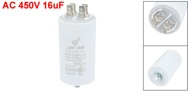Product Name Motor Capacitor Dielectric Material Polypropylene Film Housing Material Plastic Capacitance 16µF Tolerance ±5% Rated Voltage AC 450V Size 4 x 9.5cm/ 1.6" x 3.7" (Dia.*H) Thread Diameter 8mm/ 0.3" Color White Weight 98g Package Content 1 x Motor Capacitor - Reviews
