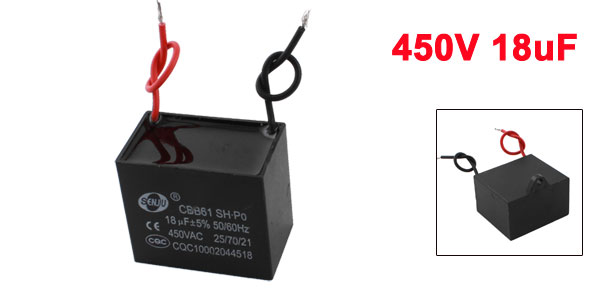 Product Name Capacitor Model CBB61 Type Polypropylene Film Capacitor Material(External) Plastic Rated Capacitance 18 uF Tolerance ±5% Rated Frequency 50/60Hz Rated Voltage AC 450V Size 4.8 x 3 x 4.8cm/1.9" x 1.2" x 1.9"(L*W*T) Mounting Hole Diameter 0.4cm/0.16" Cable Length 9cm/3.5" Main Color Black Weight 85g Package Content 1 x Capacitor - Reviews