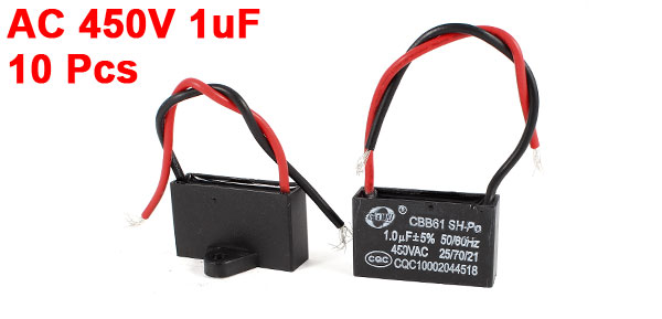 Product Name Motor Run Capacitor Model CBB61 Material Polypropylene Film Rated Capacitance 1uF Tolerance 5% Rated Frequency 50/60 Hz Rated Voltage 450V AC Overall Size 37 x 22 x 22mm/ 1.5" x 0.87" x 0.87"(L*W*T) Mount Hole Dia 4.8mm/ 0.18" Wire Length 9cm/ 3.5" Main Color Black,Red Net Weight 126g Package Content 10 x Motor Run Capacitor - Reviews