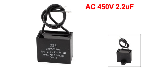 Product Name Motor Run Capacitor Material Polypropylene Film Rated Capacitance 2.2uF Tolerance 5% Rated Frequency 50/60 Hz Rated Voltage AC 450V Overall Size 38 x 30 x 20mm/ 1.5" x 1.2" x 0.8"(L*W*T) Mount Hole Dia 4mm/ 0.16" Wire Length 13mm/ 0.5" Main Color Black Net Weight 31g Package Content 1 x Motor Run Capacitor - Reviews
