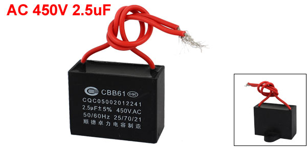 Product Name Motor Capacitor Model CBB61 External Material Plastic Dielectric Material Metalized Polypropylene Film Rated Capacitance 2.5uF Tolerance ±5% Rated Frequency 50/60Hz Rated Voltage AC 450V Body Size 37 x 30 x 28mm/ 1.45" x 1.2" x 1.1"(L*W*T) Fixing Hole Diameter 4mm/0.16" Cable Length 8cm/ 3.1" Net Weight 24g Package Content 1 x Motor Capacitor - Reviews