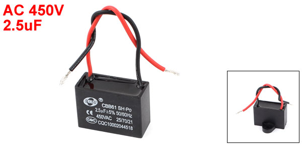 Product Name Motor Capacitor Model CBB61 Color Black External Material Plastic Dielectric Material Metallized Polypropylene Film Rated Capacitance 2.5uF Tolerance +/5% Rated Frequency 50/60Hz Rated Voltage AC 450V Body Size 38 x 27 x 30mm/ 1.5" x 1" x 1.2"(H*W*T) Fixing Hole Diameter 5mm/0.2" Cable Length 9cm/ 3.6" Net Weight 20g Package Content 1 x Motor Run Capacitor - Reviews