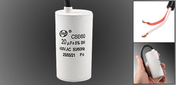 Product Name Motor Capacitor Model No. CBB60 Housing Material Plastic Dielectric Material Metallized Polypropylene Film Capacitance 20uF Tolerance ±5% Rated Voltage 450VAC Frequency 50/60Hz Body Size 40 x 73mm / 1.6" x 2.9" (D*H) Wire Size (Approx.) 170 x 6.5mm / 6.7" x 0.26" (L*Max.D) Main Color White, Black Net Weight 102g Package Content 1 x Motor Capacitor - Reviews