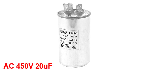 Product Name Motor Capacitor Housing Material Metal Dielectric Material Metallized Polypropylene Film Model CBB65 Capacitance 20uF Tolerance ±5% Rated Voltage 450VAC Frequency 50/60Hz Body Dimension 5 x 8cm/2" x 3.1"(D * H) Operating Temperature 40/70/21 Color Silver Tone Net Weight 185g Package Content 1 x Motor Capacitor - Reviews