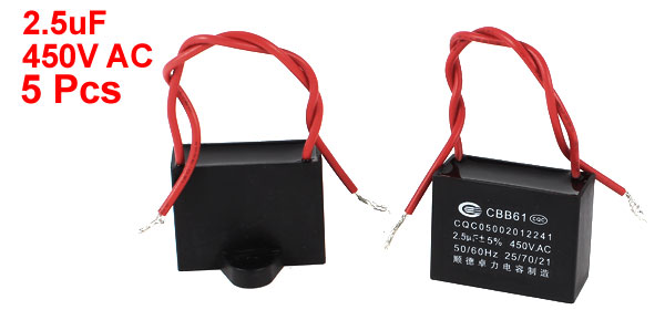 Product Name Motor Run Capacitor Model CBB61 Material Polypropylene Film Rated Capacitance 2.5uF Tolerance 5% Rated Frequency 50/60 Hz Rated Voltage 450V AC Overall Size 39 x 28 x 17mm/ 1.5" x 1.3" x 0.67"(L*W*T) Mount Hole Dia 4.5mm/ 0.18" Wire Length 11mm/ 4.3" Main Color Black,Red Net Weight 115g Package Content 5 x Motor Run Capacitor - Reviews