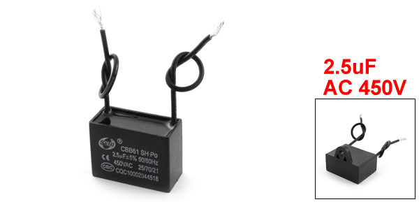DetailsAC 450V 2.5uF 50/60Hz 5% Tolerance Fan Motor Running Capacitor CBB61  Product Name Capacitor Model CBB61 Type Polypropylene Film Capacitor Material(External) Plastic Rated Capacitance 2.5uF Tolerance ±5% Rated Frequency 50/60Hz Rated Voltage AC 450V Size 3.3 x 1.8 x 2.7cm/1.3" x 0.7" x 1.1"(L*W*T) Mounting Hole Diameter 0.4cm/0.16" Cable Length 9.5cm/3.7" Main Color Black Weight 25g Package Content 1 x Capacitor