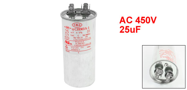 Product Name Motor Capacitor Model No. CBB65A-1 Dielectric Material Metallized Polypropylene Film Housing Material Metal Capacitance 25uF Tolerance ±5% Rated Voltage 450VAC Frequency 50/60Hz Body Dimension 4.5 x 10cm / 1.7" x 3.9" (D * H) Operating Temperature 40/70/21 Color Silver Tone Weight 167g Package Content 1 x Motor Capacitor - Reviews