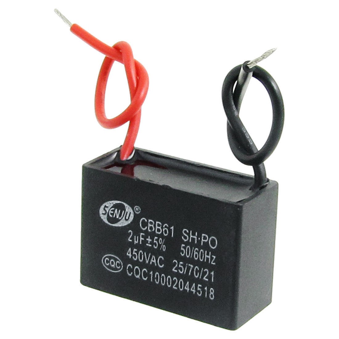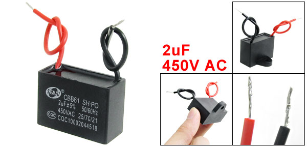 Terminal Wire Ambient Temperature 25/70/21 Rated Capacitance 2uF Tolerance 5% Rated Frequency 50/60Hz Rated Voltage 450V AC Size 3.7 x 2.6 x 1.6cm/1.45" x 1" x 0.63"(L*W*T) Wire Length 10cm/ 3.9" Install Bore Diameter 0.5cm/ 0.2" Main Color Black Weight 24g Package Content 1 x Motor Run Capacitor - Reviews