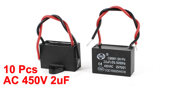 Product Name Motor Run Capacitor Model CBB61 Material Polypropylene Film Rated Capacitance 2uF Tolerance 5% Rated Frequency 50/60 Hz Rated Voltage 450V AC Overall Size 38 x 29 x 25mm/ 1.5" x 1.1" x 1"(L*W*T) Mount Hole Dia 4.8mm/ 0.19" Wire Length 9cm/ 3.5" Main Color Black,Red Net Weight 205g Package Content 10 x Motor Run Capacitor - Reviews