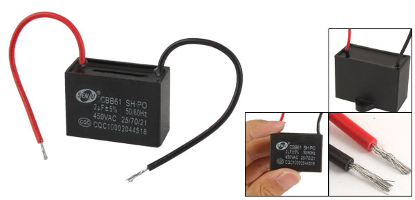 Product Name Motor Capacitor Housing Material Plastic Dielectric Material Metalized Polypropylene Model CBB61 Capacitance 2uF Tolerance +/-5% Rated Voltage 450VAC Frequency 50/60Hz Body Size 3.7 x 2.7 x 1.6cm / 1.45" x 1.06" x 0.63" (L * W * T) Wire Length(Approx.) 10cm / 3.9" Color As Picture Shown Weight 23g Package Content 1 x Motor Capacitor - Reviews
