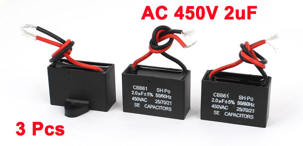 Product Name Motor Capacitor Model CBB61 External Material Plastic Dielectric Material Metallized Polypropylene Rated Capacitance 2uF Tolerance ±5% Rated Frequency 50/60Hz Rated Voltage AC 450V Size 38 x 25 x 16mm/ 1.5" x 1" x 0.6" (L*W*T) Hole Dia. 5mm/ 0.2" Cable Length 10cm/ 4" Weight 60g Package Content 3 x Motor Run Capacitor - Reviews