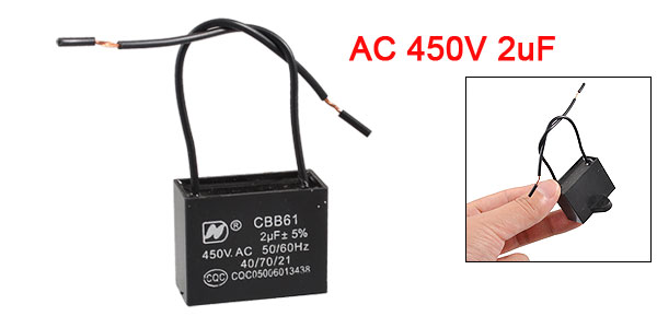 Product Name Motor Capacitor Model CBB61 External Material Plastic Dielectric Material Metalized Polypropylene Rated Capacitance 2uF Tolerance +/-5% Rated Frequency 50/60Hz Rated Voltage AC 450V Size 3.7 x 2.9 x 1.75cm/ 1.5" x 1.14" x 0.68" (L*W*T) Hole Dia. 4mm/ 0.16" Cable Length 9cm/ 3.5" Weight 21g Package Content 1 x Motor Run Capacitor - Reviews