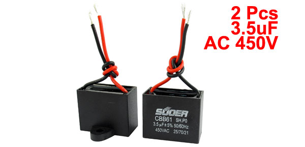 Product Name Motor Run Capacitor Model CBB61 Dielectric Material Metallized Polypropylene External Material Plastic Rated Capacitance 3.5uF Tolerance ±5% Rated Frequency 50/60Hz Rated Working Voltage AC 450V Mounting Hole Diameter 4mm / 0.16" Boby Size 3.7 x 3 x 2cm / 1.5" x 1.2" x 0.8" (L*W*H) Wire Length(Each) 10cm / 3.8" Main Color Black Weight 60g Package Content 2 x Motor Run Capacitor - Reviews