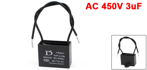 Product Name Motor Capacitor Model CBB61 Color Black External Material Plastic Dielectric Material Metalized Polypropylene Film Rated Capacitance 3uF Tolerance ±5% Rated Frequency 50/60Hz Rated Voltage AC 450V Body Size 38 x 28 x 29mm/ 1.5" x 1.1" x 1.1"(H*W*T) Fixing Hole Diameter 5mm/0.2" Cable Length 12.5cm/ 4.9" Net Weight 24g Package Content 1 x Motor Run Capacitor - Reviews