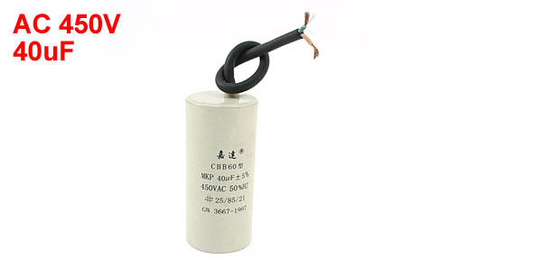 Product Name Motor Capacitor Model CBB60 Dielectric Material Polypropylene Film Housing Material Plastic Capacitance 40µF Tolerance ±5% Rated Frequency 50/60Hz Rated Voltage AC 450V Temperature Coefficient 25/85/21 Size 9.7 x 4.5cm/3.8" x 1.8"(L*D) Color Off White Weight 145g Package Content 1 x Motor Capacitor - Reviews