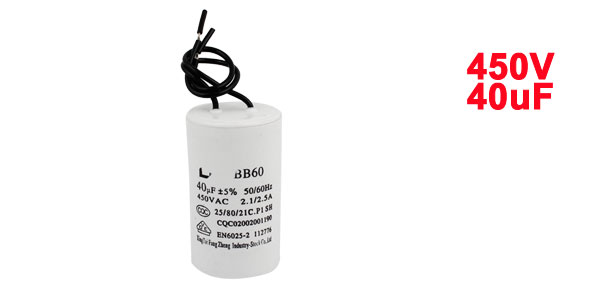 Product Name Polypropylene Film Capacitor Housing Material Plastic Dielectric Material Polypropylene Model CBB60 Capacitance 40uF Tolerance ±5% Rated Voltage 450VAC Frequency 50/60Hz Body Size 4.2 x 7.3cm/ 1.7" x 2.9" (D*H) Cable Length 13cm/ 0.5" Color White Weight 88g Package Content 1 x Polypropylene Film Capacitor - Reviews