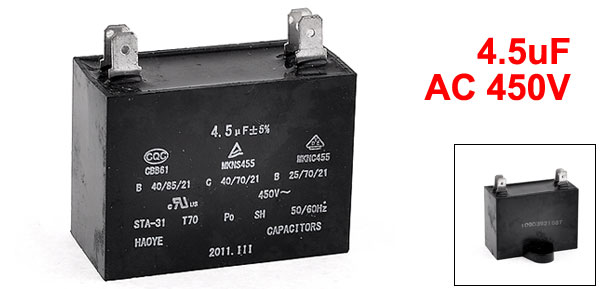 Product Name Air Condition Capacitor Material Polypropylene Film Rated Capacitance 4.5uF Rated Frequency 50/60 Hz Rated Voltage AC 450V Overall Size 48 x 42 x 28mm / 1.9" x 1.7" x 1.1" (L*W*T) Mount Hole Dia 4mm / 0.16" Pin Size 7 x 4mm / 0.28" x 0.16" (L*W) Pin Spacing 30 x 5mm / 1.18" x 0.2" (L*W) Main Color Black Net Weight 38g Package Content 1 x Air Condition Capacitor  - Reviews