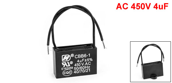 Product Name Motor Capacitor Housing Material Plastic Dielectric Material Polypropylene Film Model CBB6-1 Capacitance 4uF Tolerance ±5% Rated Voltage 450VAC Frequency 50/60Hz Operating Temperature 40/070/21 Wire Length0 12cm/4.7" Overall Size 4.7 x 3.1 x 2.8cm/ 1.9" x 1.2" x 1.1" (L*W*H) Color Black Weight 30g Package Content 1 x Motor Capacitor - Reviews