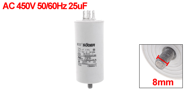 Product Name Motor Capacitor Model CBB60A-1 Dielectric Material Polypropylene Film Housing Material Plastic Capacitance 25µF Tolerance ±5% Rated Frequency 50/60Hz Rated Voltage AC 450V Size 9 x 4.5cm/ 3.5" x 1.8" (H*D) Thread Diameter 8mm/ 0.31" Color White Weight 128g Package Content 1 x Motor Capacitor - Reviews