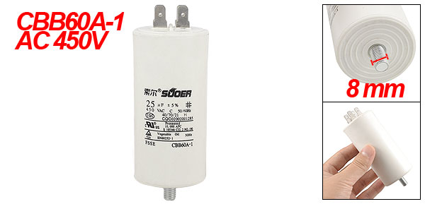 Product Name Motor Capacitor Model CBB60A-1 Dielectric Material Polypropylene Film Housing Material Plastic Capacitance 25µF Tolerance ±5% Rated Frequency 50/60Hz Rated Voltage AC 450V Size 12 x 4.5cm/ 4.7" x 1.8" (H*D) Thread Diameter 8mm/ 0.31" Color White Weight 128g Package Content 1 x Motor Capacitor - Reviews