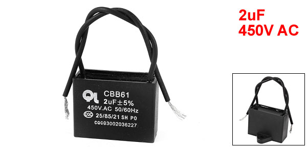 Product Name Motor Run Capacitor Model CBB61 Material Polypropylene Film Rated Capacitance 2uF Tolerance 5% Rated Frequency 50/60 Hz Rated Voltage 450V AC Overall Size 38 x 29 x 16mm/ 1.5" x 1.1" x 0.63"(L*W*T) Mount Hole Dia 5mm/ 0.2" Wire Length 9.5mm/ 3.7" Main Color Black Net Weight 21g Package Content 1 x Motor Run Capacitor - Reviews