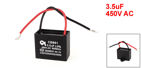 Product Name Motor Run Capacitor Model CBB61 Material Polypropylene Film Rated Capacitance 3.5uF Tolerance 5% Rated Frequency 50/60 Hz Rated Voltage 450V AC Overall Size 39 x 31 x 20mm/ 1.5" x 1.3" x 0.8"(L*W*T) Mount Hole Dia 4.5mm/ 0.18" Wire Length 9.5mm/ 3.7" Main Color Black,Red Net Weight 28g Package Content 1 x Motor Run Capacitor - Reviews
