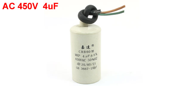 DetailsAC 450V 50/60Hz 4uF CBB60 Motor Running Capacitor for Washing Machine  Product Name Motor Capacitor Model CBB60 Dielectric Material Polypropylene Film Housing Material Plastic Capacitance 4µF Tolerance ±5% Rated Frequency 50/60Hz Rated Voltage AC 450V Temperature Coefficient 25/85/21 Size 6.3 x 3.5cm/2.5" x 1.4"(L*D) Color Off White Weight 64g Package Content 1 x Motor Capacitor