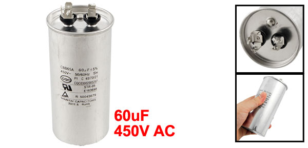 Product Name Capacitor Housing Material Metal Model CBB65A Capacitance 60uF Tolerance +/-5% Rated Voltage 450VAC Frequency 50/60Hz Total Size 5.5 x 11.5cm / 2.1" x 4.5" (D * H) Color Silver Tone Weight 250g Package Content 1 x Capacitor - Reviews