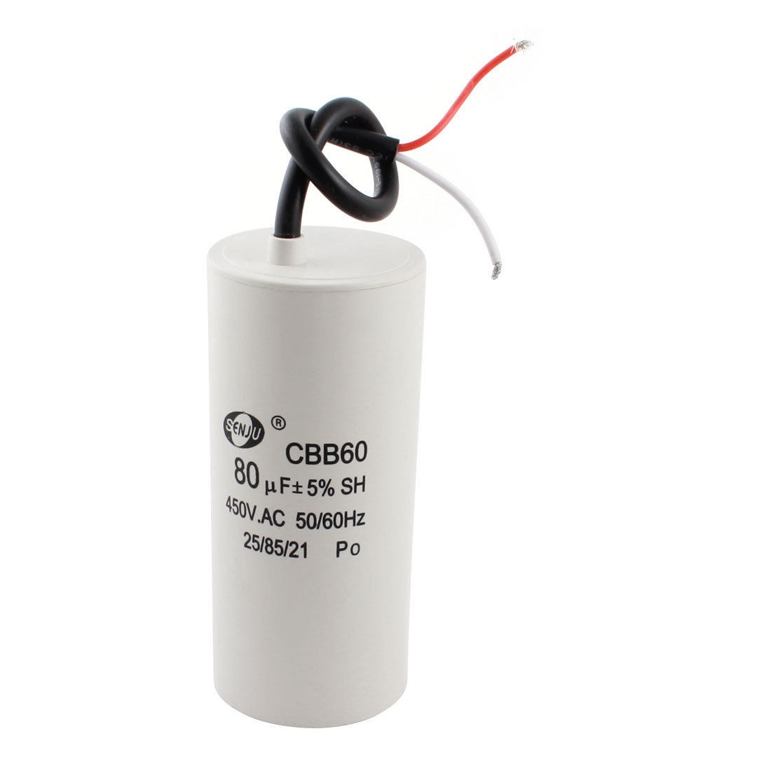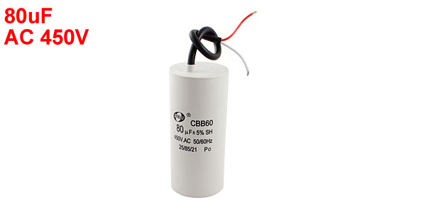 Product Name Polypropylene Film Capacitor Housing Material Plastic Dielectric Material Polypropylene Film Model CBB60 Capacitance 80uF Tolerance ±5% Rated Voltage AC 450V Frequency 50/60Hz Operating Temperature 25/85/21 Body Size 5.4 x 12cm/ 2.1" x 4.7" (D*H) Cable Length 13cm/ 0.5" Color Gray Weight 280g Package Content 1 x Polypropylene Film Capacitor - Reviews