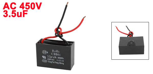Product Name Motor Capacitor Model CBB61 Color Black External Material Plastic Dielectric Material Polypropylene Film Rated Capacitance 3.5uF Tolerance ±5% Rated Frequency 50/60Hz Rated Voltage AC 450V Body Size 48 x 33 x 21mm/ 1.9" x 1.3" x 0.83"(L*W*T) Fixing Hole Diameter 4.5mm/0.18" Cable Length 9cm/ 3.5" Net Weight 36g Package Content 1 x Motor Run Capacitor - Reviews