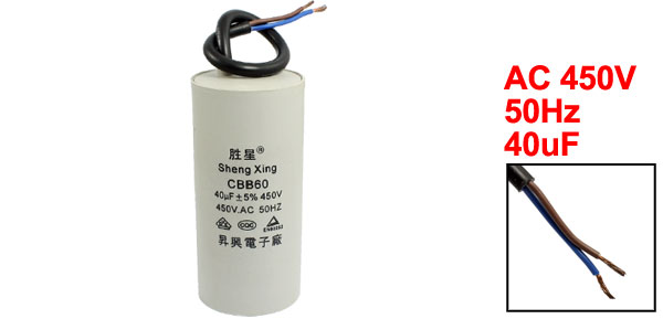 Product Name Polypropylene Film Capacitor Housing Material Plastic Dielectric Material Polypropylene Film Model CBB60 Capacitance 40uF Tolerance ±5% Rated Voltage 450VAC Frequency 50Hz Body Size 4.8 x 10.5cm/ 1.9" x 4.1" (D*H) Cable Length 19.5cm/ 7.7" Color White, Black Weight 223g Package Content 1 x Polypropylene Film Capacitor - Reviews