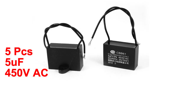 Product Name Motor Run Capacitor Model CBB61 Material Polypropylene Film Rated Capacitance 5uF Tolerance 5% Rated Frequency 50/60 Hz Rated Voltage 450V AC Overall Size 47 x 33 x 19mm/ 1.85" x 1.3" x 0.75"(L*W*T) Mount Hole Dia 5mm/ 0.2" Wire Length 12.5mm/ 4.9" Main Color Black Net Weight 180g Package Content 5 x Motor Run Capacitor - Reviews